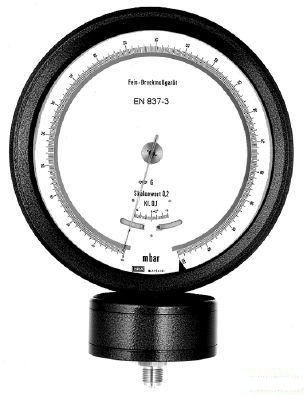 膜片敏感元件是帶有波浪的圓形膜片,膜片本身位于兩 個(gè)法蘭之間,或焊接在法蘭盤上或其邊緣夾在兩個(gè)法蘭盤之間。膜片一側(cè)受到測(cè)量介質(zhì)的壓力。這樣膜片所產(chǎn)生的微小 彎曲變形可用來(lái)間接測(cè)量介質(zhì)的壓力。壓力的大小由指針顯示。膜片與波登管相比其傳遞力較大。由于膜片本身周圍邊緣固定,所以其防振性較好。膜片壓力表可達(dá)到很高的過(guò)壓保護(hù)(比如膜片貼附在上法蘭盤上)。膜片還可以加上保護(hù)鍍層以提高防腐性。利用開(kāi)口法蘭,沖洗,開(kāi)口等措施可用膜片壓力表測(cè)量粘度很大的,不清潔的及結(jié)晶的介質(zhì)。膜片壓力表的壓力測(cè)量范圍在0...16mbar及0...40bar測(cè)量精度在1.6或2.5